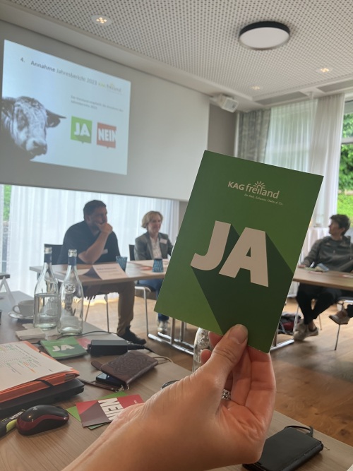 Der Vorstandspräsident Stefan Schürmann und der Geschäftsleiter Beat Schumacher führten durch die Versammlung. Die Stimmberechtigen genehmigten standesgemäss das GV-Protokoll des Vorjahres, den Jahresbericht und die Jahresrechnung 2023, aus der ein erfreulicher Jahresabschluss resultierte. Beat Schumacher blickte zurück auf das vergangene Jahr: KAGfreiland ist finanziell solide und gesund aufgestellt, es ist Kontinuität und Stabilität eingekehrt. Den Fokus richtete KAGfreiland im Jahr 2023 auf die bestehenden sowie auf neue Tierwohl-Projekte. Die beiden Fachmitarbeiterinnen Chiara Augsburger und Sarah Haug informierten die Anwesenden über das Kälber-Projekt zur Antibiotika-Reduktion «Zuhause gross werden» sowie über das Hoftötungs-Projekt «Lebwohl». Zum ersten Mal fand im Jahr 2023 eine Projektausschreibung statt: KAGfreiland unterstützt Projekte von anderen Organisationen oder Privatpersonen zur Förderung und Verbesserung des Tierwohls bei Nutztieren. Von den sechs erhaltenen Gesuchen wurden vier Projekte angenommen, welche KAGfreiland im Jahr 2024 aktiv und/oder finanziell unterstützt. Über die Medienarbeit und Kommunikationskampagnen informierte anschliessend die Kommunikationsverantwortliche Simone Steiner.