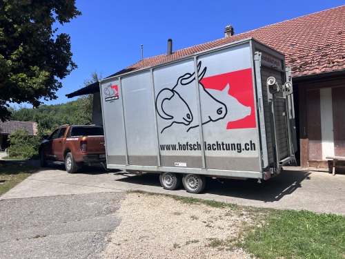Es ist 13 Uhr, als ein Anhänger mit der Aufschrift «Hofschlachtung Schweiz» auf dem KAGfreiland-Hof in Rohr bei Olten vorfährt. Bei dem Anhänger handelt es sich um eine mobile Schlachteinrichtung mit welcher Hoftötungen durchgeführt werden. Eine solche Hoftötung wird heute zum ersten Mal auf dem KAGfreiland-Hof von Christoph Hümbelin stattfinden. Der Dienstleister der Hofschlachtung GmbH parkiert den Anhänger und steigt aus dem Pickup. Er wird heute die Hoftötung durchführen. Der Landwirt Christoph Hümbelin empfängt den Dienstleister. Gemeinsam wird der bevorstehende Vorgang besprochen. Die mobile Plattform, auf welcher die Tiere für die Hoftötung fixiert werden, steht schon im Laufhof der Milchkühe bereit für den Einsatz. Es sind jedoch noch keine Tiere zu sehen. Die Milchkuhherde von Christoph Hümbelin ist im Stall und frisst genüsslich Heu.