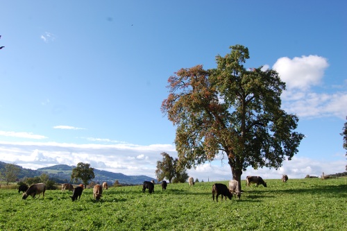 Unsere Tiere ernähren sich von Gras, im Sommer auf der Weide, im Winter mit Graskonserven wie Heu und Silage. Diese Fütterung ohne Kraftfutter ist absolut Wiederkäuer gerecht. Die Tiere wachsen langsam und sind mit rund zwei Jahren vollständig ausgewachsen. Das Fleisch dieser Tiere ist sehr aromatisch, geschmackvoll und zart. In der klassischen Rindermast werden die Tiere möglichst intensiv gefüttert, und sind in der halben Zeit gross, netto werden dabei jedoch Proteine aus dem Ackerfutter vernichtet. Nur die graslandbasierte Rindfleischproduktion hat eine positive Proteinbilanz. Gemäss einer neuen Studie vom Forschungsinstitut für biologischen Landbau in Frick entsteht aus der Bio-Weiderinderhaltung eine hervorragende Fleischqualität, nicht zuletzt die Omega 3 Fettsäuren, welche dieses rote Fleisch zu einem gesunden Lebensmittel machen.