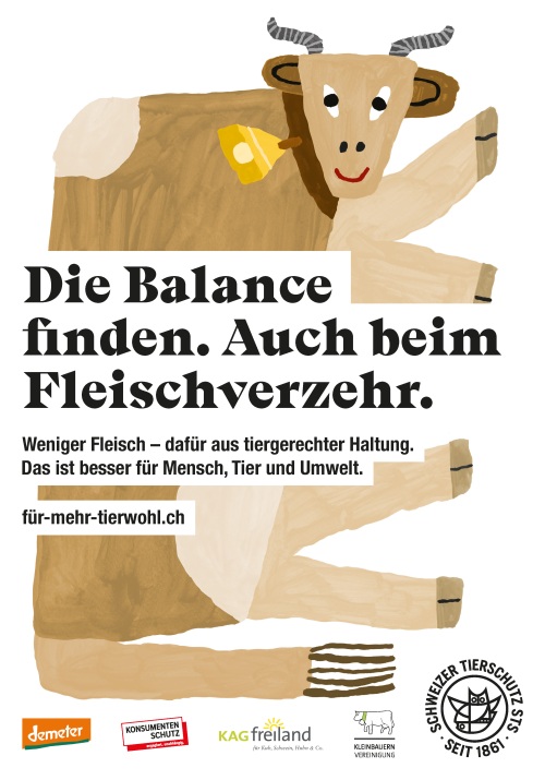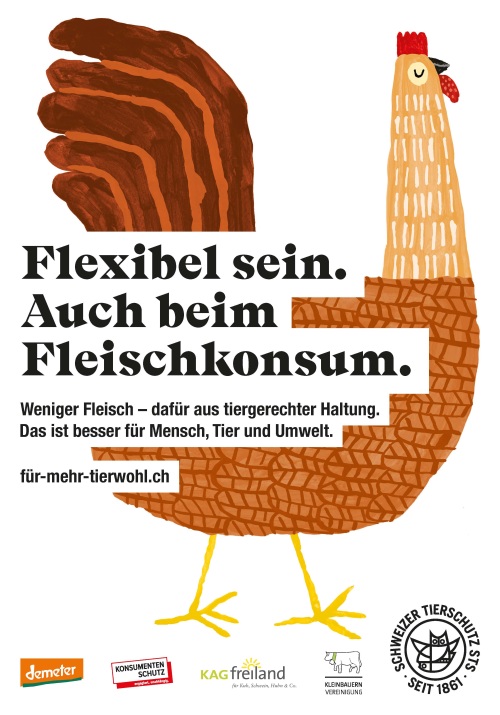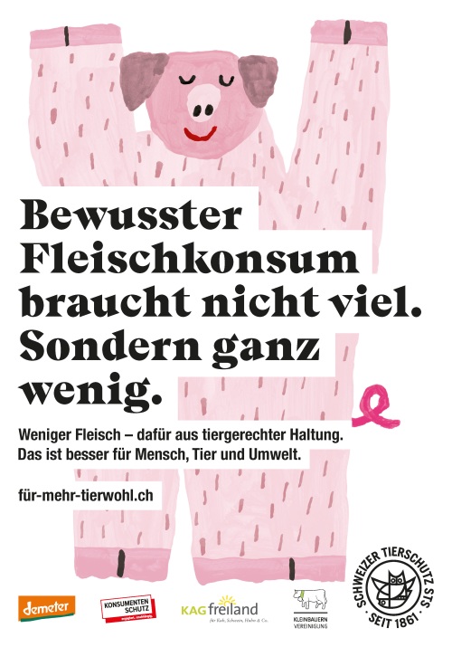 In vielen Städten in der Deutschschweiz hängen in den Monaten Februar und März 2022 witzige Plakate und Digital Panels mit ansprechenden Illustrationen von Kuh, Schwein und Huhn, verschiedenen Slogans und der Botschaft «Weniger Fleisch – dafür aus tiergerechter Haltung». Auch in den sozialen Medien ist die Kampagne anzutreffen. Lanciert hat die Kampagne der Schweizer Tierschutz STS in Kooperation mit KAGfreiland, Demeter, der Kleinbauernvereinigung und dem Konsumentenschutz.